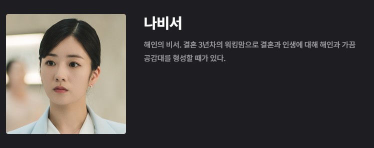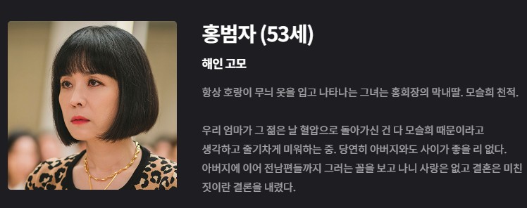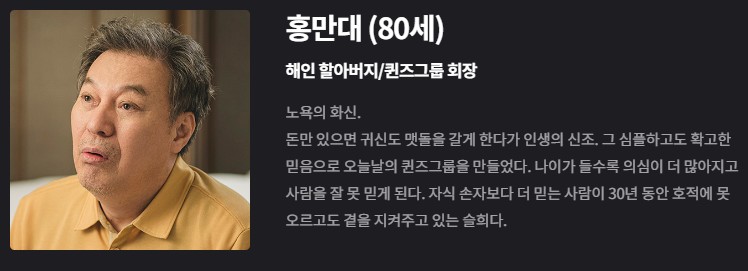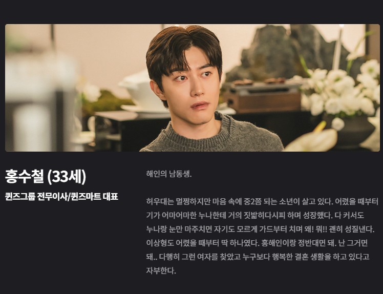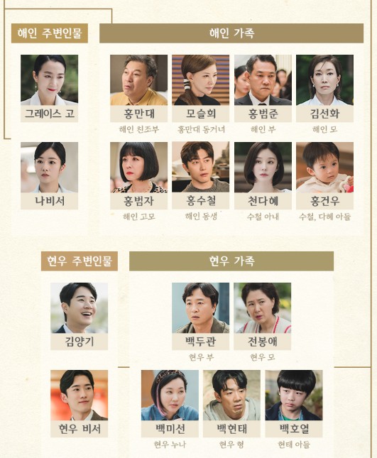 홍해인 (김지원): 퀸즈 그룹의 재벌 3세이자 백현우의 배우자로, 드라마는 그녀와 현우의 관계가 거쳐가는 다양한 변화를 통해 둘 사이의 사랑과 성장을 깊게 탐구합니다. 해인은 가족과 사랑, 그리고 자신의 정체성 사이에서 여러 어려움을 겪으며 성장하는 캐릭터입니다.