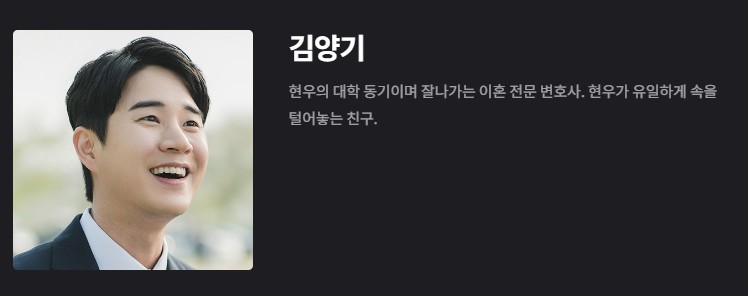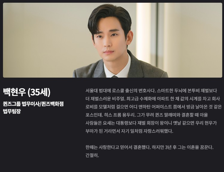 백현우 (김수현): 서울대 법대 출신의 로스쿨 변호사로, 처음에는 순수한 사랑으로 결혼하지만, 시간이 지남에 따라 이혼을 고민하게 됩니다. 가족들과의 갈등, 자본의 유혹 속에서도 해인과의 만남을 통해 새로운 사랑을 경험하게 되는 인물입니다.