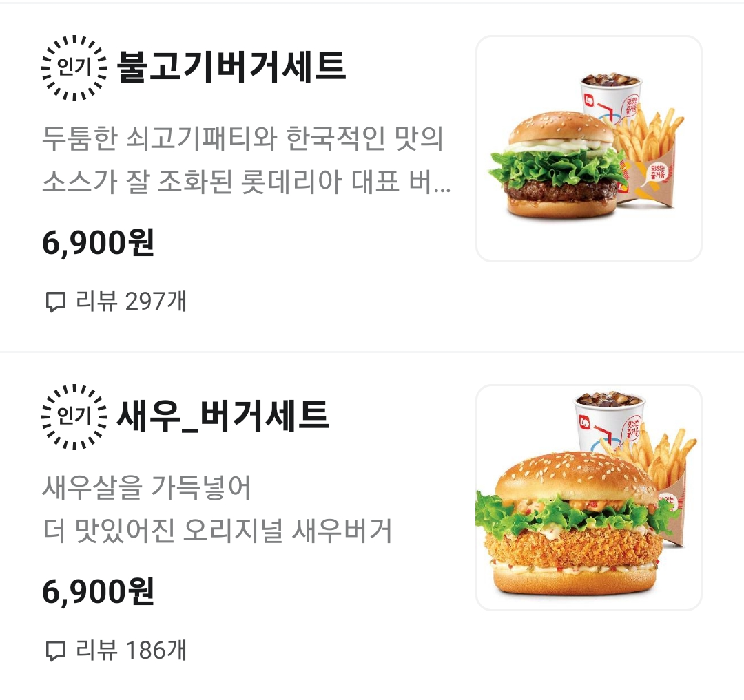 불고기버거 세트와 새우버거 새트는 둘다 6900원입니다.