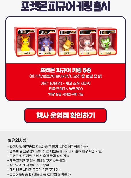 - 피규어 종류: 피카츄, 이브이, 뮤, 팬텀, 나오하 총 5종의 포켓몬 피규어 키링이 출시되었습니다.