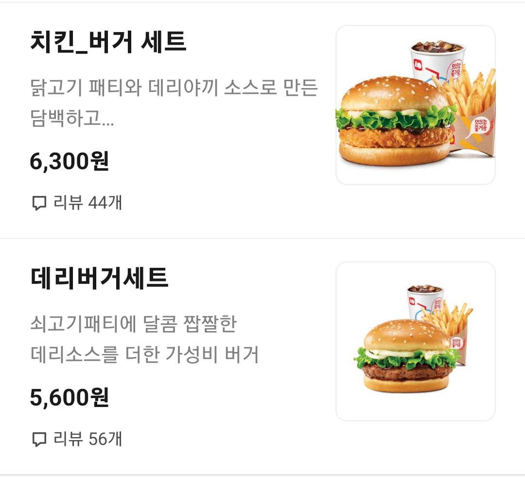 데리버거 세트는 5600원, 치킨버거세트는 6300원