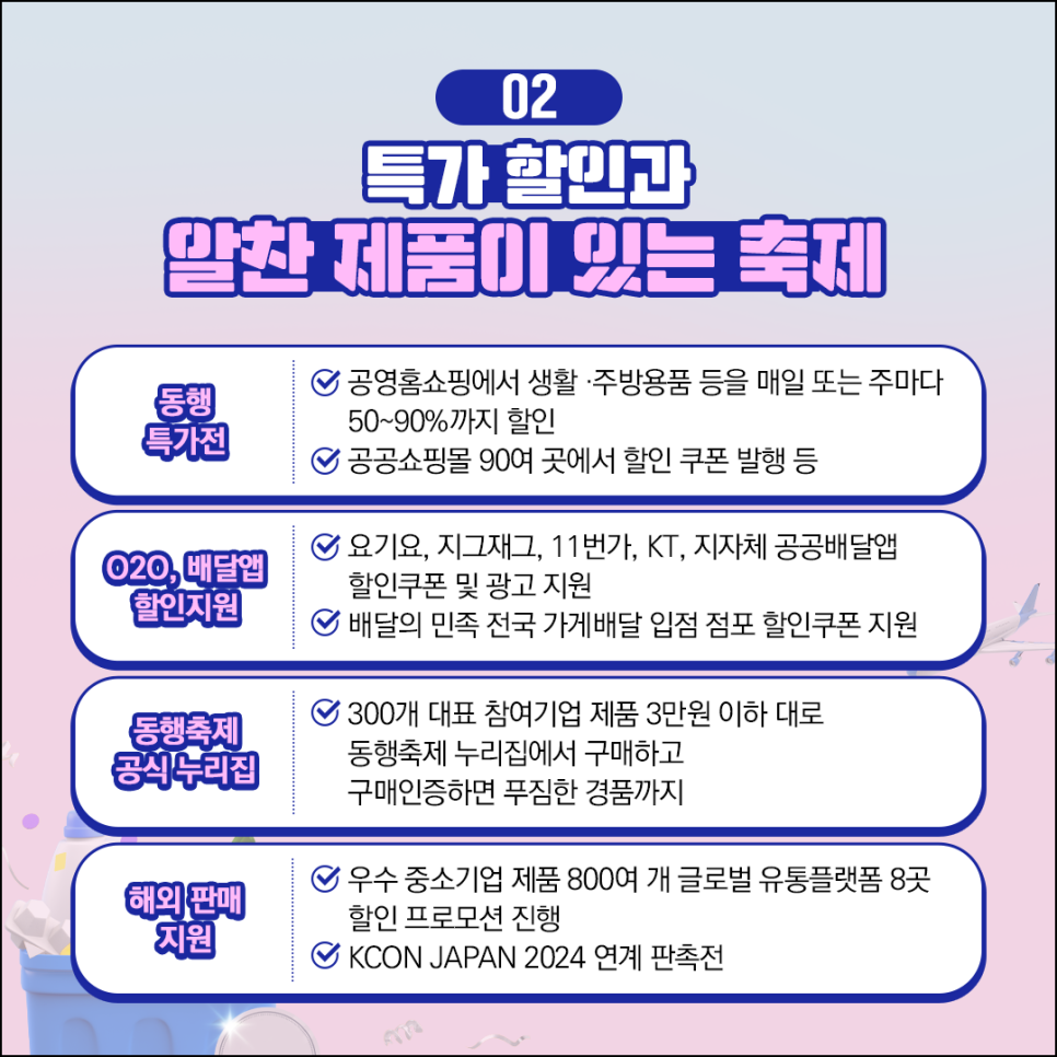 - 온라인 특별 프로모션: 온라인 쇼핑몰, 라이브 커머스, 제품 판매 등 다양한 온라인 이벤트 진행