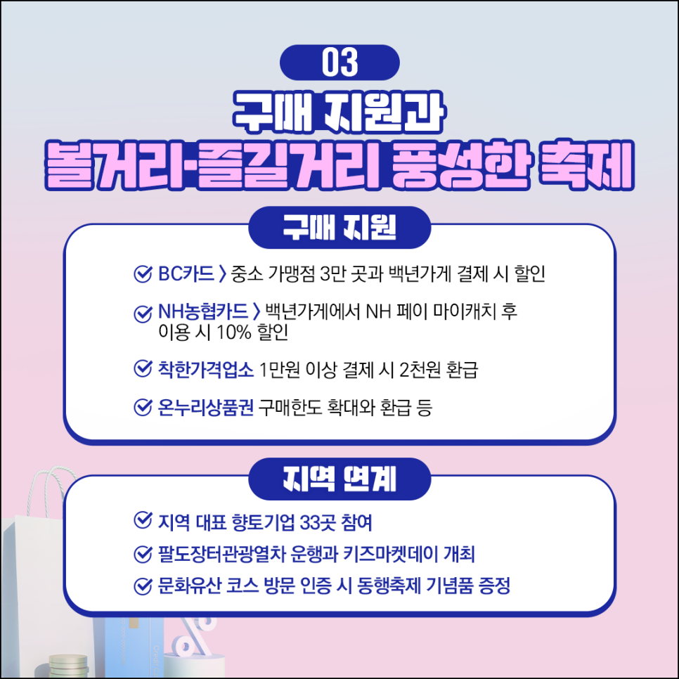 축제 기간 동안 BC카드 결제 시 할인 혜택과 온누리상품권의 구매 한도 확대 등 다양한 구매 지원이 제공될 예정입니다. 지역을 대표하는 향토기업에서도 최대 20%까지 할인된 제품을 만나보실 수 있습니다.