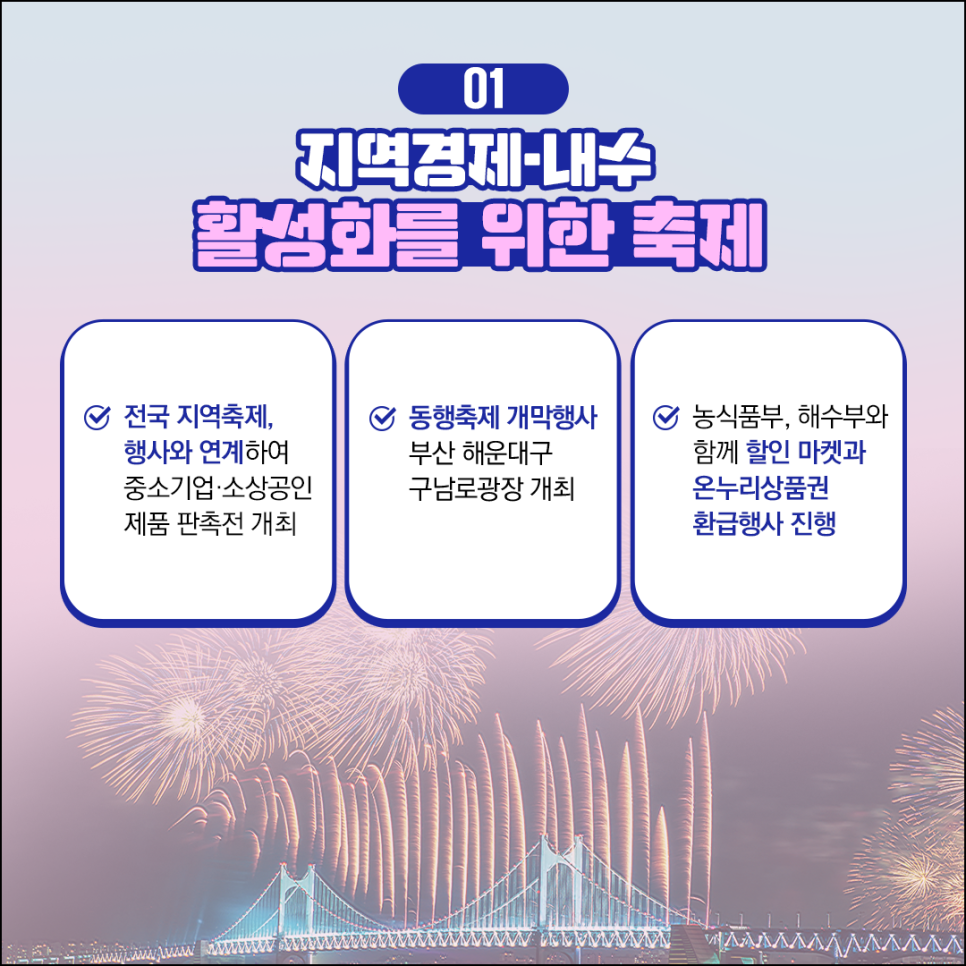 지역경제와 내수 활성화를 위해 전국의 행사와 연계하여 중소기업・소상공인 제품 판촉전을 열게 됩니다. 이천의 '도자기축제'부터 괴산의 '빨간맛 페스티벌'까지 전국 50곳의 지역축제와 연계하여 다채로운 판촉 행사를 진행할 예정입니다. 개막행사는 부산 해운대에서 열리며, 상점가와 전통시장이 공존하는 해운대구 구남로광장에서 진행될 예정입니다.