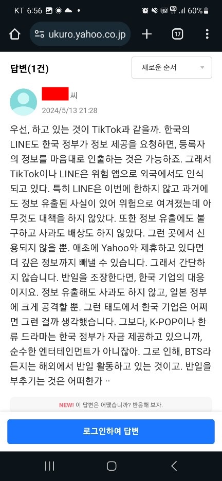 라인 일본 야후 지분 정리를 일본 정부가 요구한 것에 대해, 한국인으로 속상하고 기분이 좋지 않습니다.