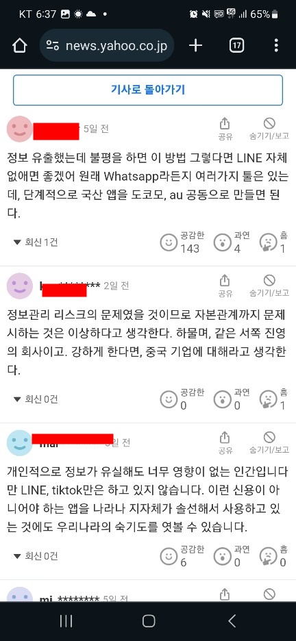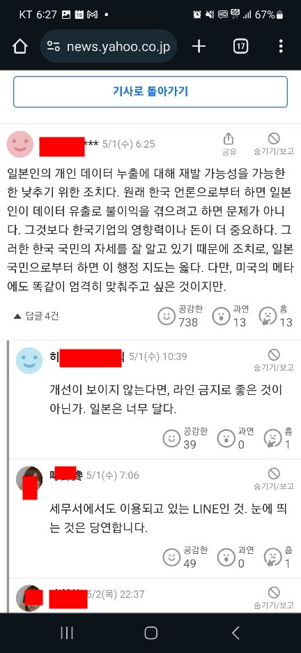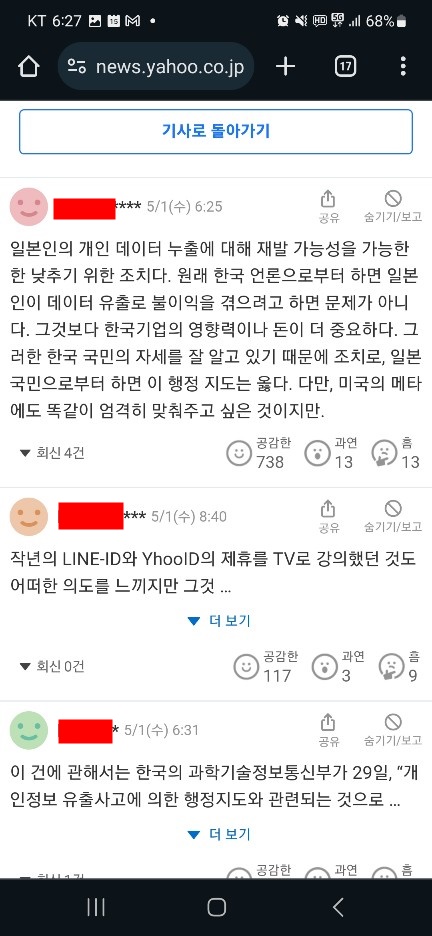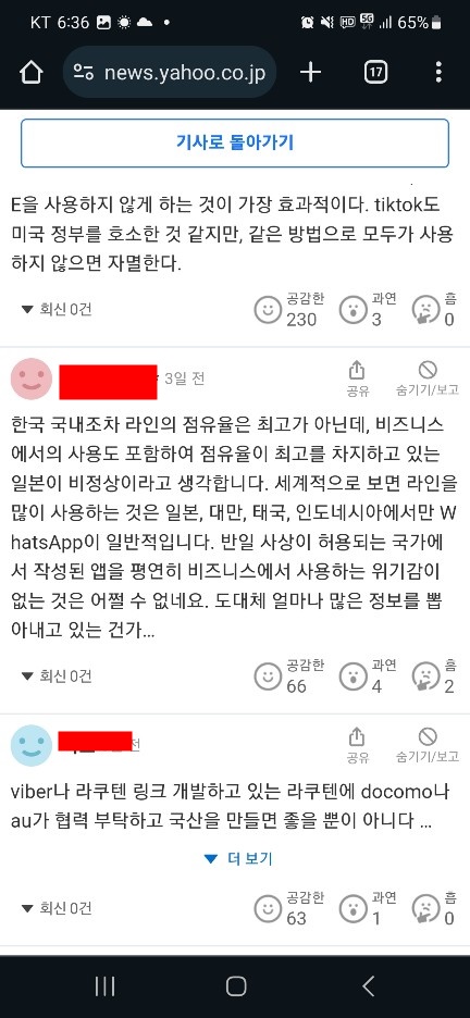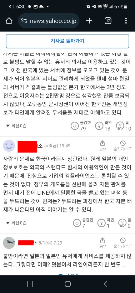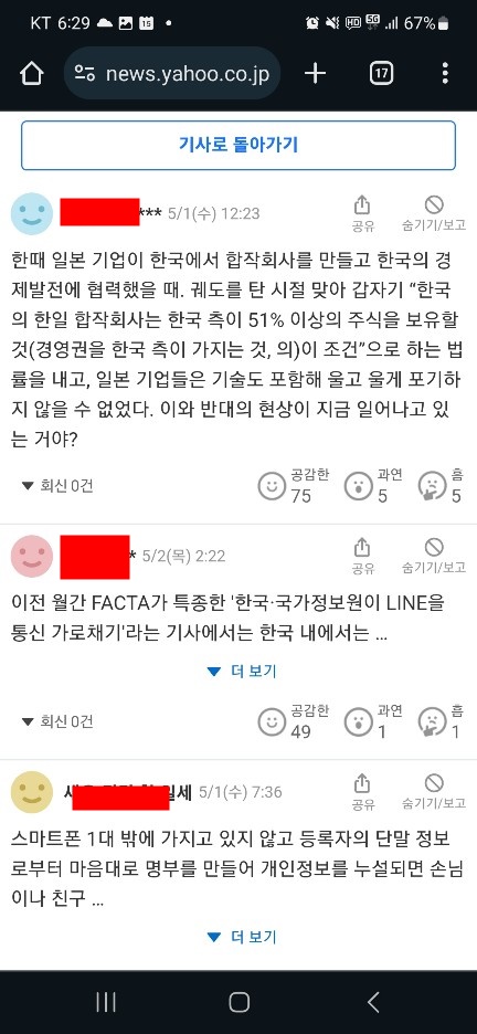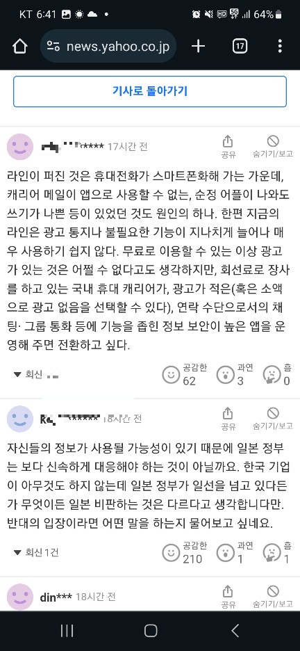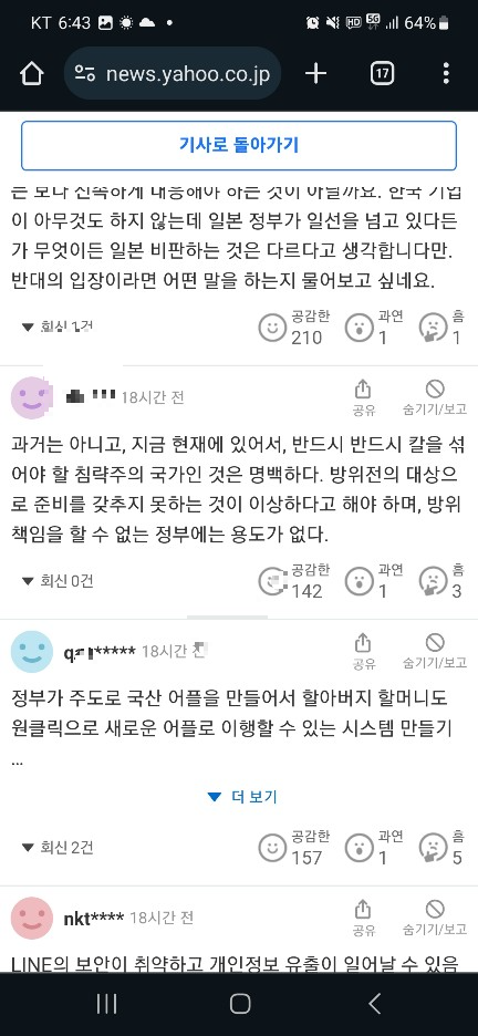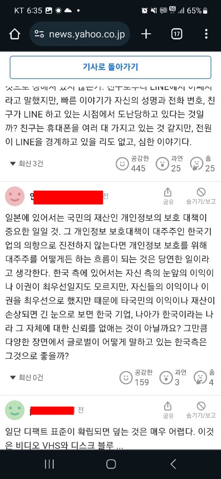 아래는 일본 야후에서 네이버 지분 정리에 대한 댓글들 반응을 모은 것입니다.