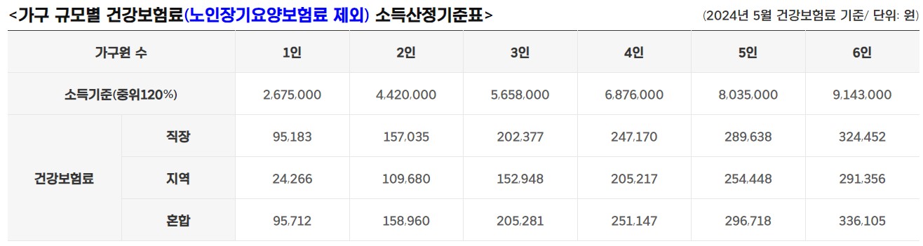 소득: 2024년 5월 건강보험료 기준 중위소득 120% 이하인 가구