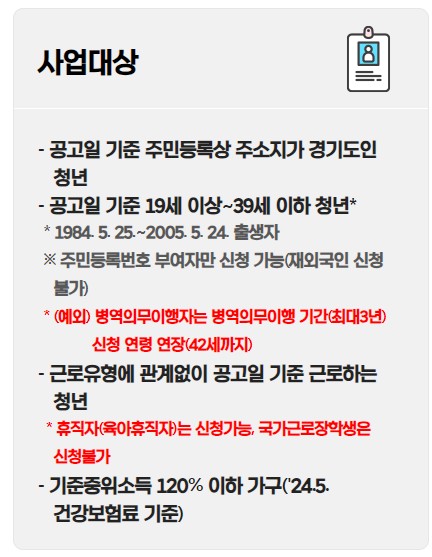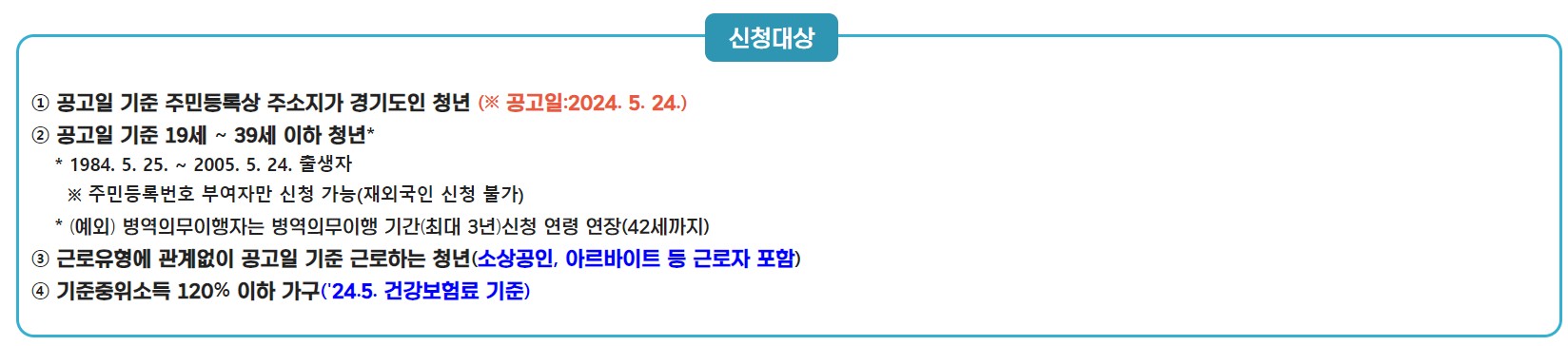 연령: 공고일('24.5.24.) 기준 만 19세 이상 ~ 39세 이하 (군필자는 최대 42세까지 신청 가능)