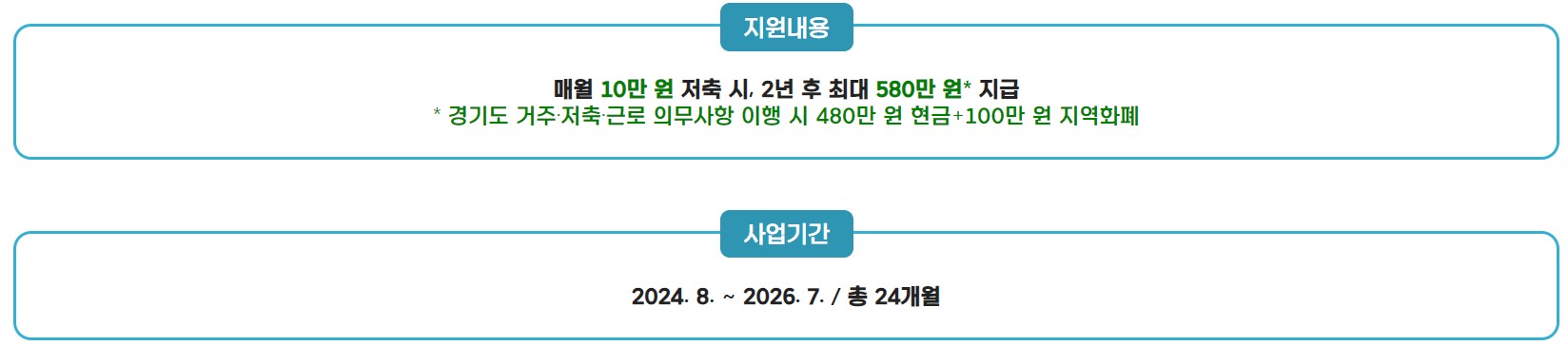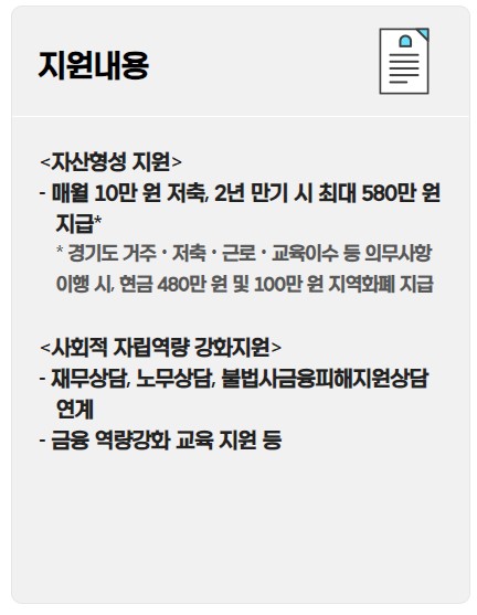 매월 10만원씩 2년 동안 꾸준히 저축하면, 경기도가 똑같이 10만원씩 지원금을 매칭해 드립니다. 게다가 만기 시에는 100만원 상당의 지역화폐까지 추가로 지급되어 총 580만원의 목돈을 마련할 수 있습니다.