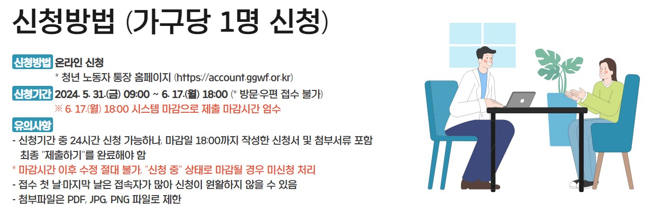 신청 방법: 경기도 청년 노동자 통장 홈페이지 (https://account.ggwf.or.kr) 온라인 신청
