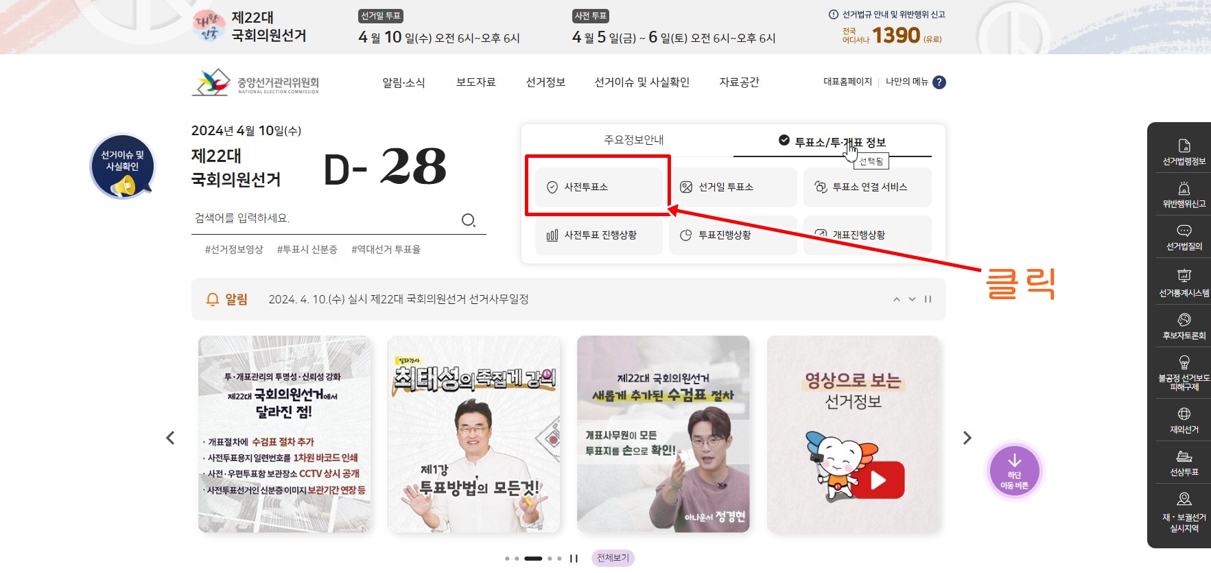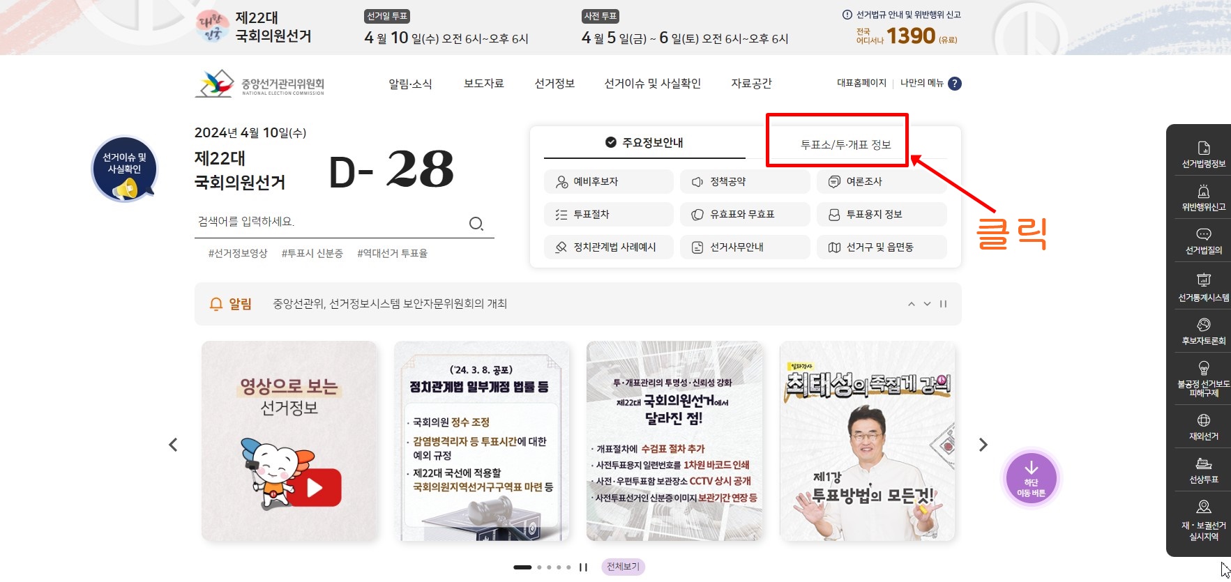 홈페이지가 나타나면, 화면에 보이는 <투표소/투-개표 정보> 를 클릭합니다.